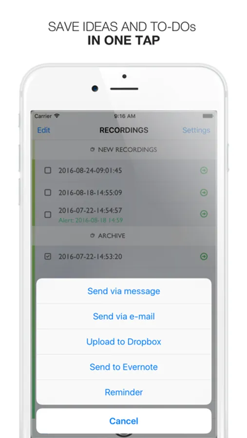 A powerful voice recorder for iPhone and Apple Watch. Just tap the icon, say a short note, and it becomes your reminder or you IMMEDIATELY find the note on Dropbox, Evernote or e-mail. All in just ONE TAP!