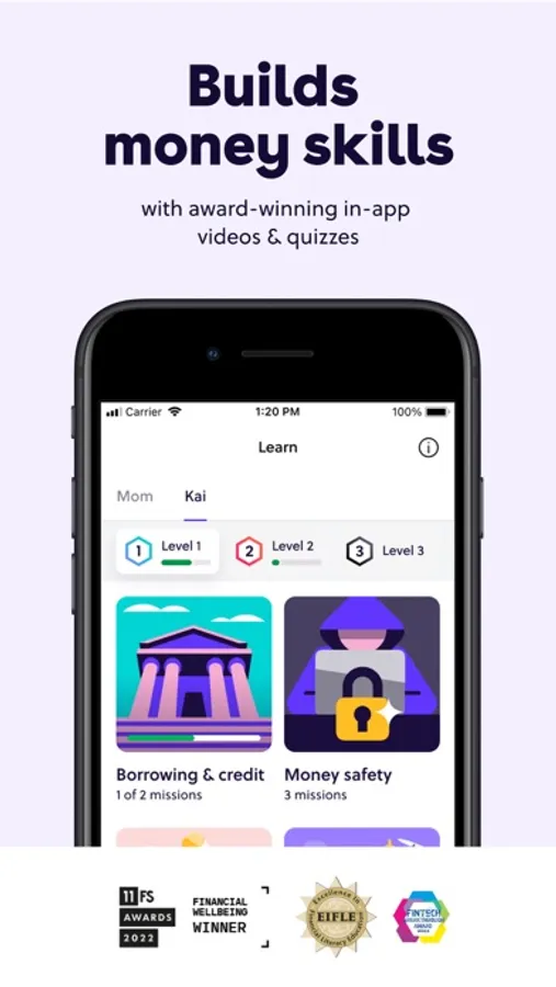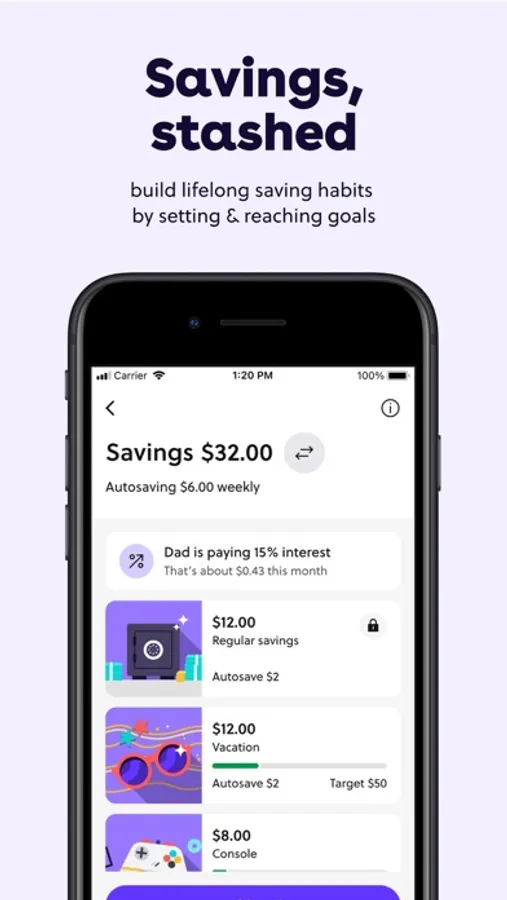 Young people can customize savings goals and set up an auto-save amount. Parents can reward saving habits by setting parent-paid interest in-app—and keep goals on track by locking them.