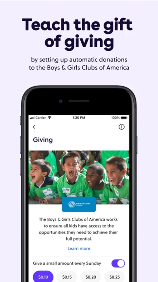 Set up donations to the Boys & Girls Clubs of America or create a savings goal for a chosen charity—a small act of kindness teaches how rewarding it feels to donate money.