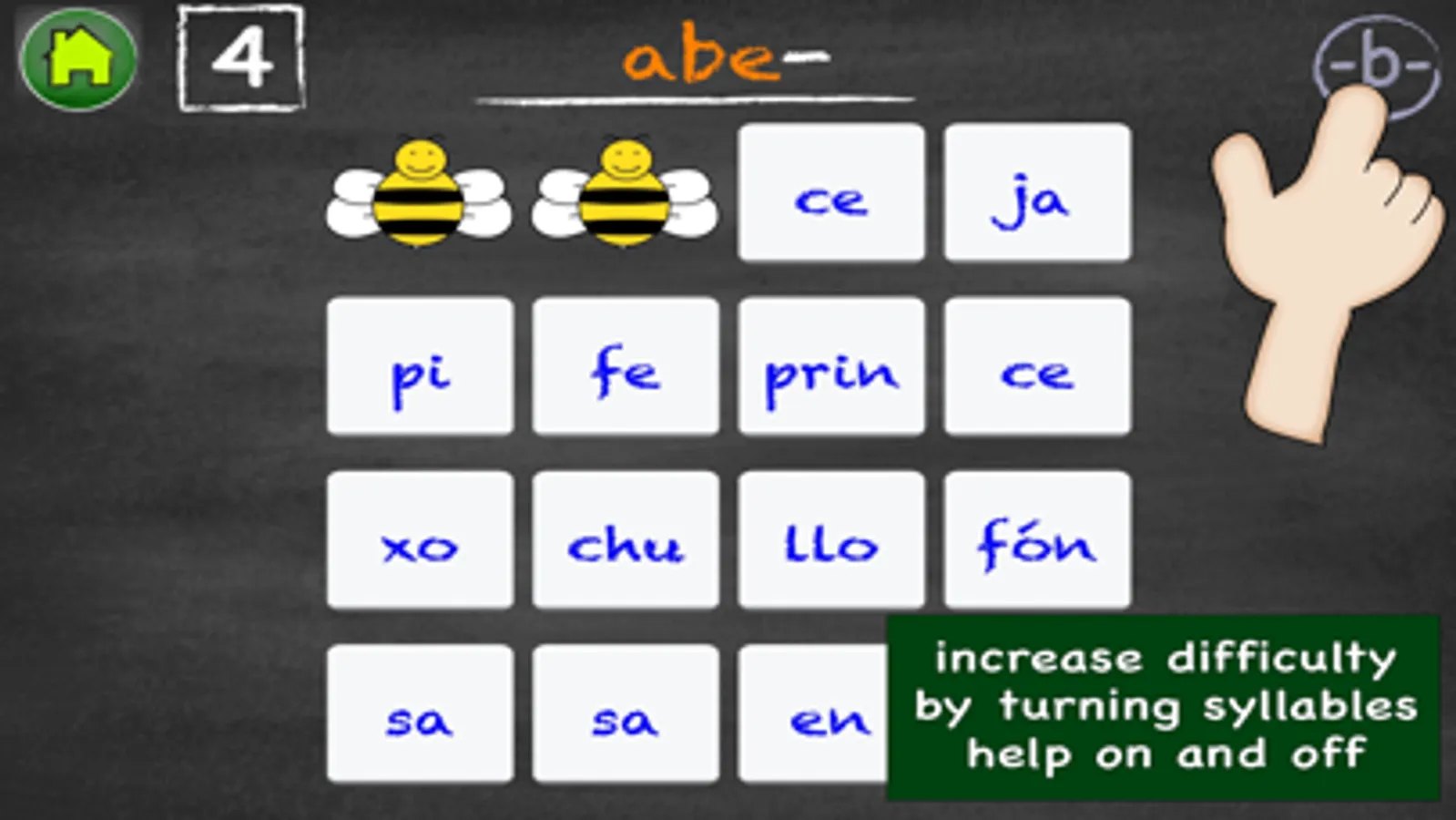 Start reading 2 syllable words and advance through levels to read 3 and 4 syllables words. Levels increase the number of syllables the words are made of and/or the number of cards that are presented.