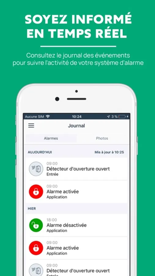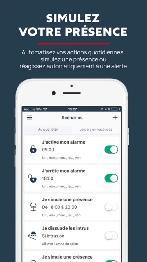 Grâce à l'application IMA PROTECT, mettez en marche et à l’arrêt votre système, où que vous soyez, quand vous le souhaitez. Utilisez les scénarios mis à votre disposition pour planifier l’activation de votre alarme en fonction de votre emploi du temps, piloter vos objets connectés ou simuler votre présence. Avec la géolocalisation, soyez notifié en quittant votre domicile pour ne pas oublier d’activer votre alarme. Consultez le journal des évènements pour suivre l'activité de votre système d'alarme.