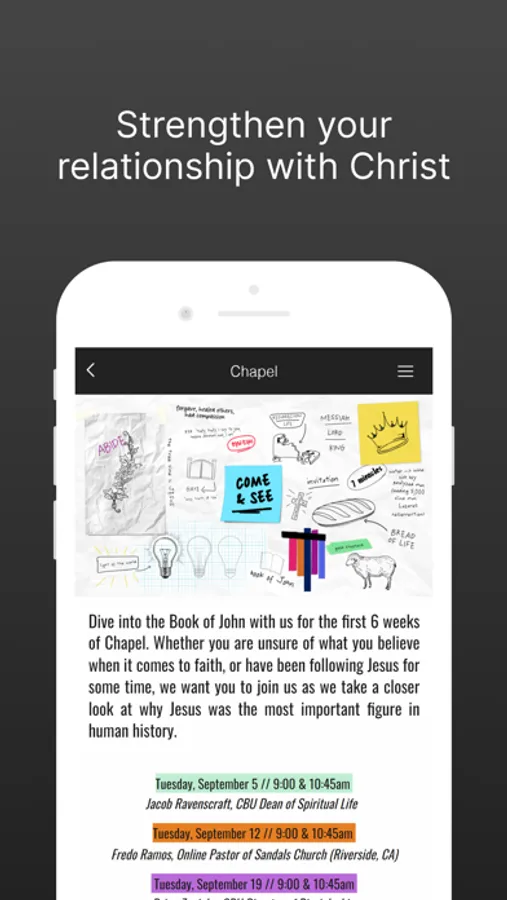 This app is designed to help you connect with a community of people who are taking steps forward in their relationship with Christ. It is full of resources to help you grow in your faith. Available to any current/former CBU student, staff and faculty.