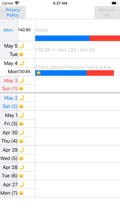 Simple easy-to-use free blood pressure management notebook calendar application that records the maximum blood pressure (upper / systolic pressure) and the minimum blood pressure (lower / diastolic pressure) measured by the blood pressure monitor every day and displays the graph automatically. The always display notes for diabetes countermeasures HbA1c and so on, everyday notes for recording comments such as weight, sleeping time, medicine taking, body temperature. Time series blood pressure measurement record note which can be easily used twice daily, after getting up and before going to bed. Switch the first day of the week on Sunday or Monday.