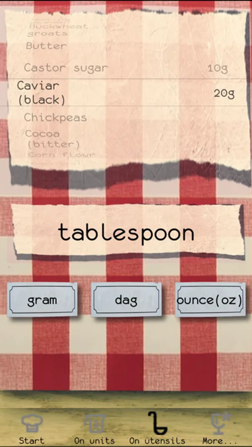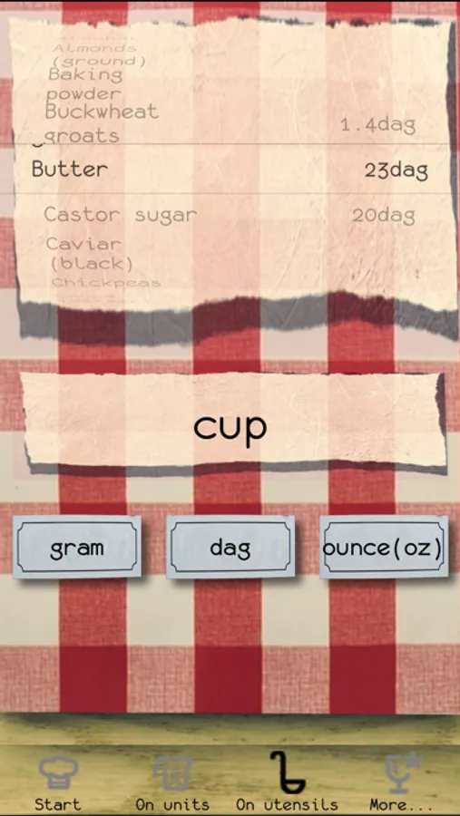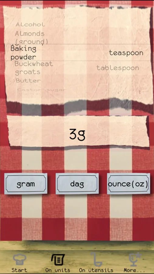 • przelicznik z utensyliów kuchennych (szklanka, łyżka, łyżeczka) na jednostki (gramy, dekagramy, mililitry, uncje) oraz jednostek na utensylia
