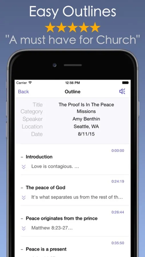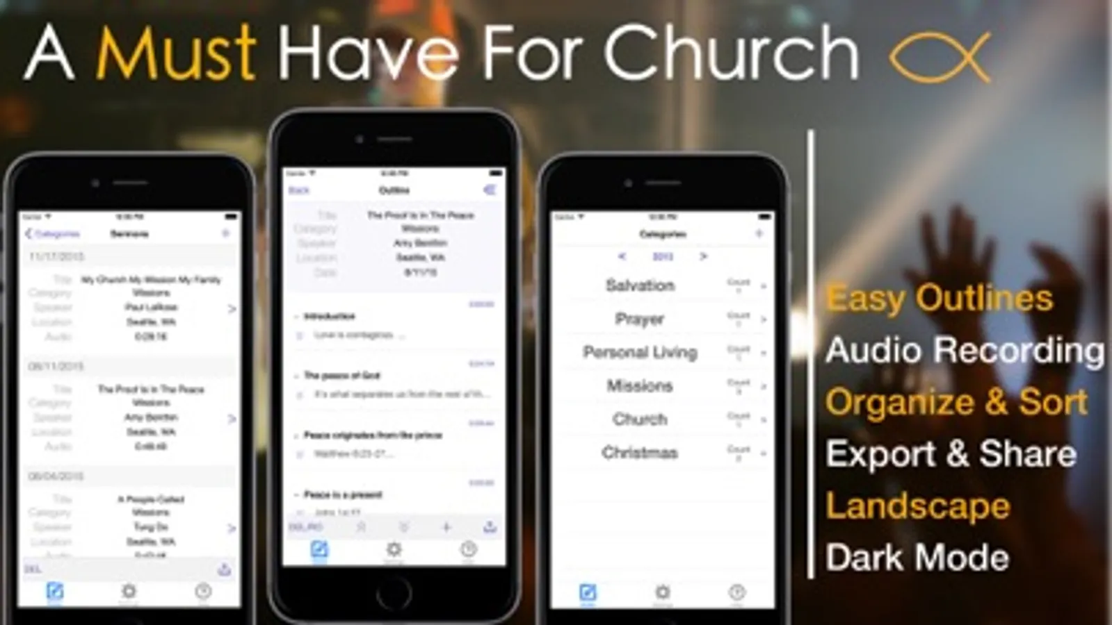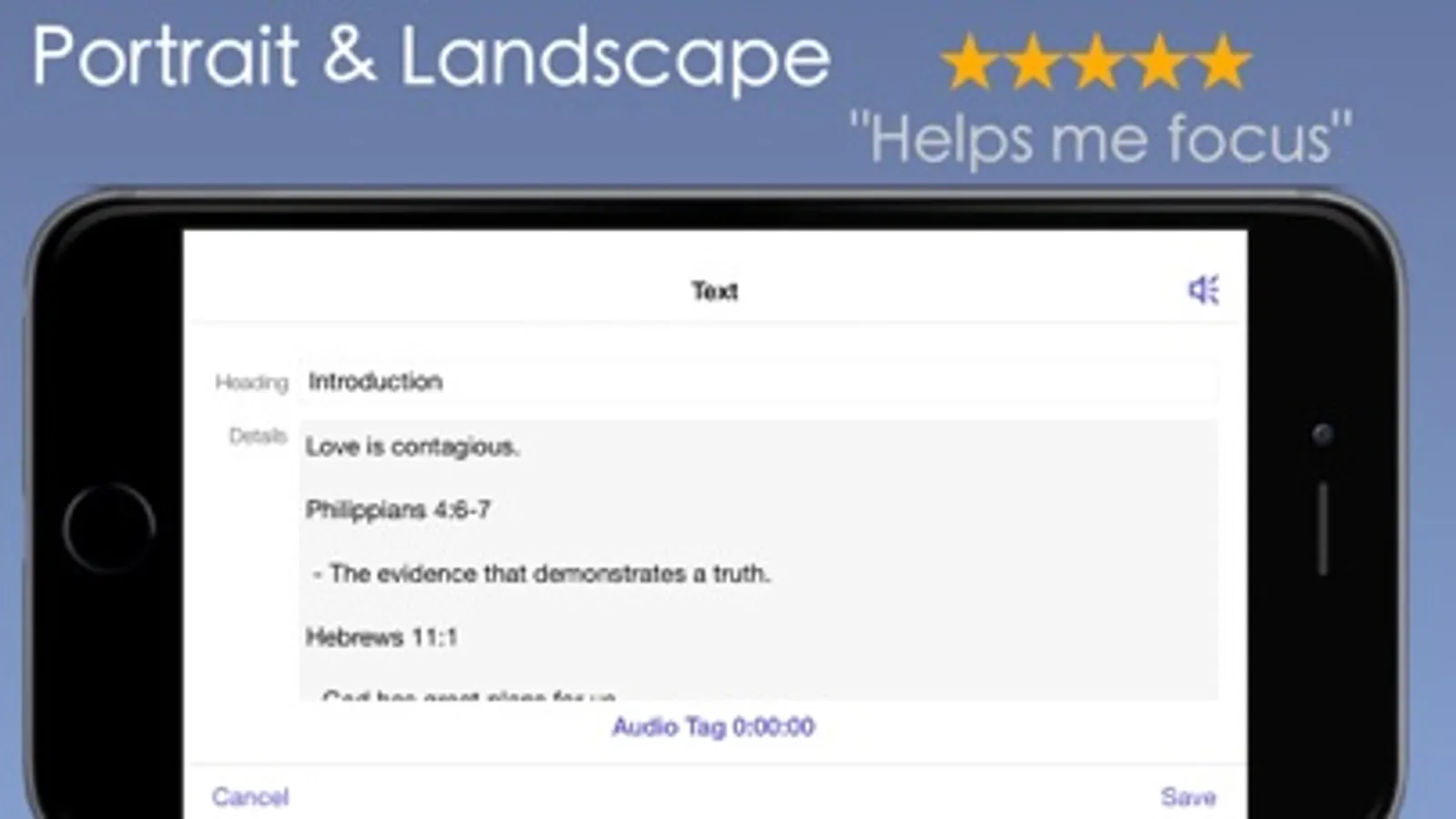 Sermon Notes is an application to help you get the most out of a sermon or lecture. Featuring a user intuitive interface and audio recording sizes optimized for the mobile platform.