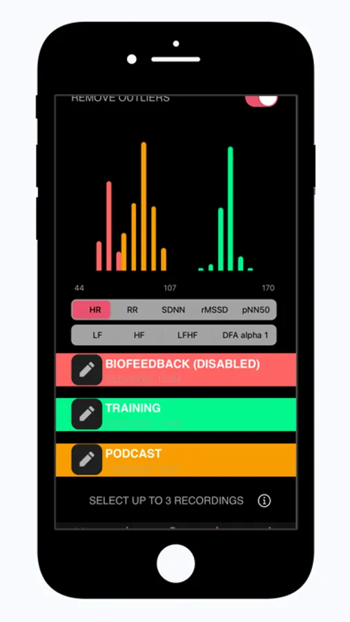 - Comparison between up to 3 recordings lets you get a better understanding of differences in HRV under different contexts in a glance. The comparison modality includes also Outlier removal