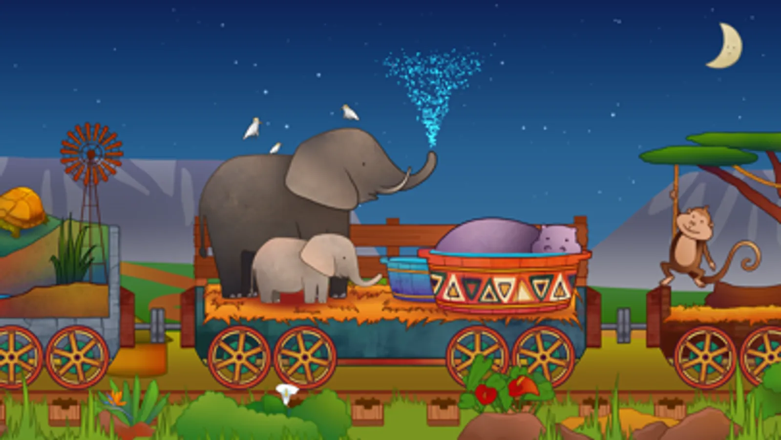 All aboard the Safari train, we're going to Africa! Join the lion conductor and his fellow travelers on a journey through a fun and interactive landscape. Touch the monkey and watch him pull the leopard's tail, listen to the laughing zebra, and see the sneezing baby elephant.