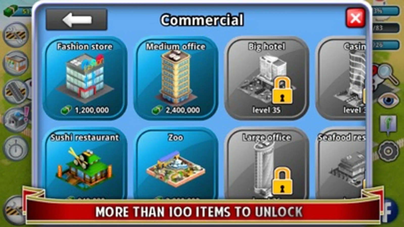 Build a business empire with a choice of 85+ unique buildings, like hotels, cinema's, offices, bakeries, restaurants, and even oil platforms.