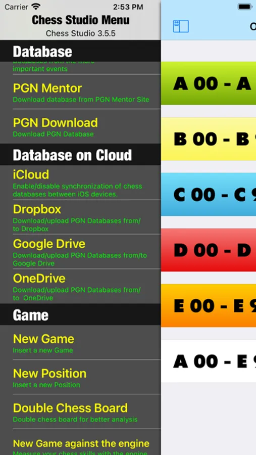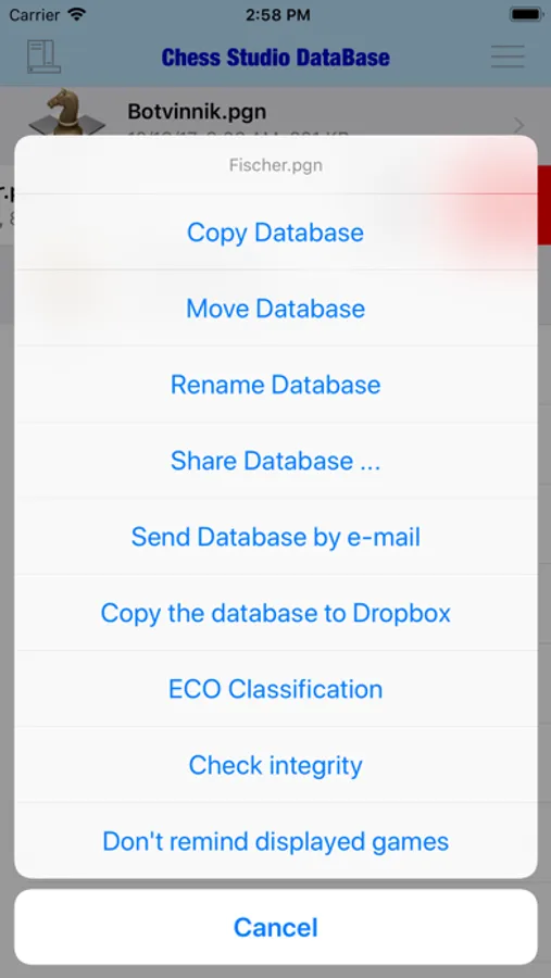 • Uploading and Downloading PGN Database to/from Dropbox, Google Drive, OneDrive.