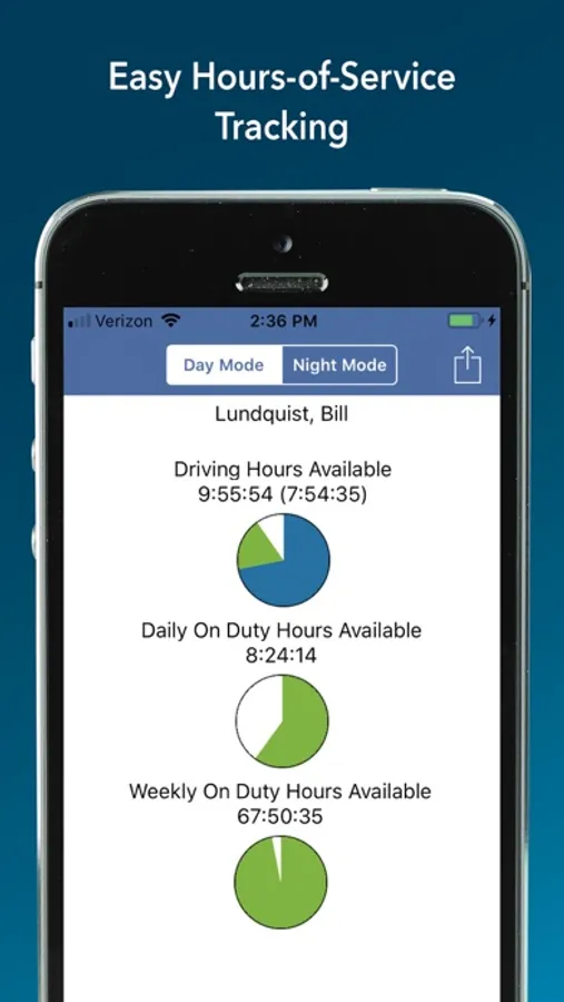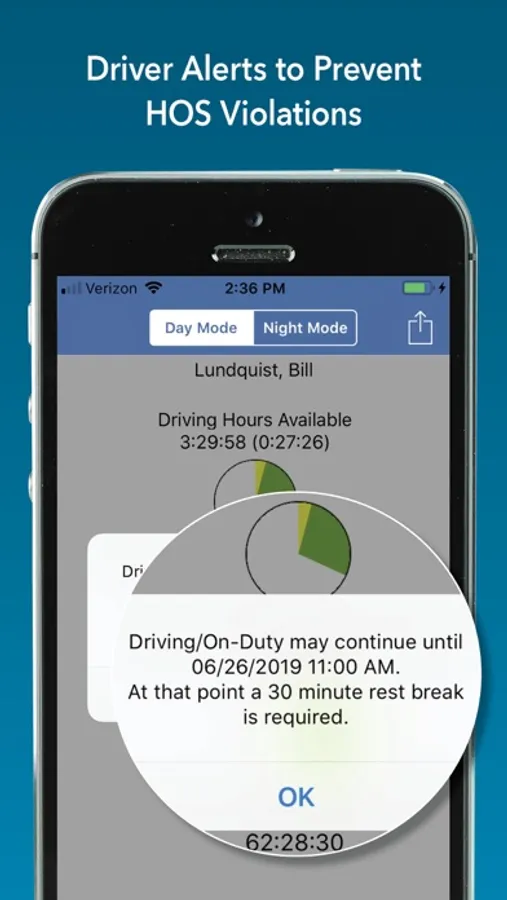 HOS COMPLIANCE ALERTS - App continuously checks drivers’ hours against the current DOT hours-of-service rules and company rulesets, and presents alerts to drivers of impending violations.