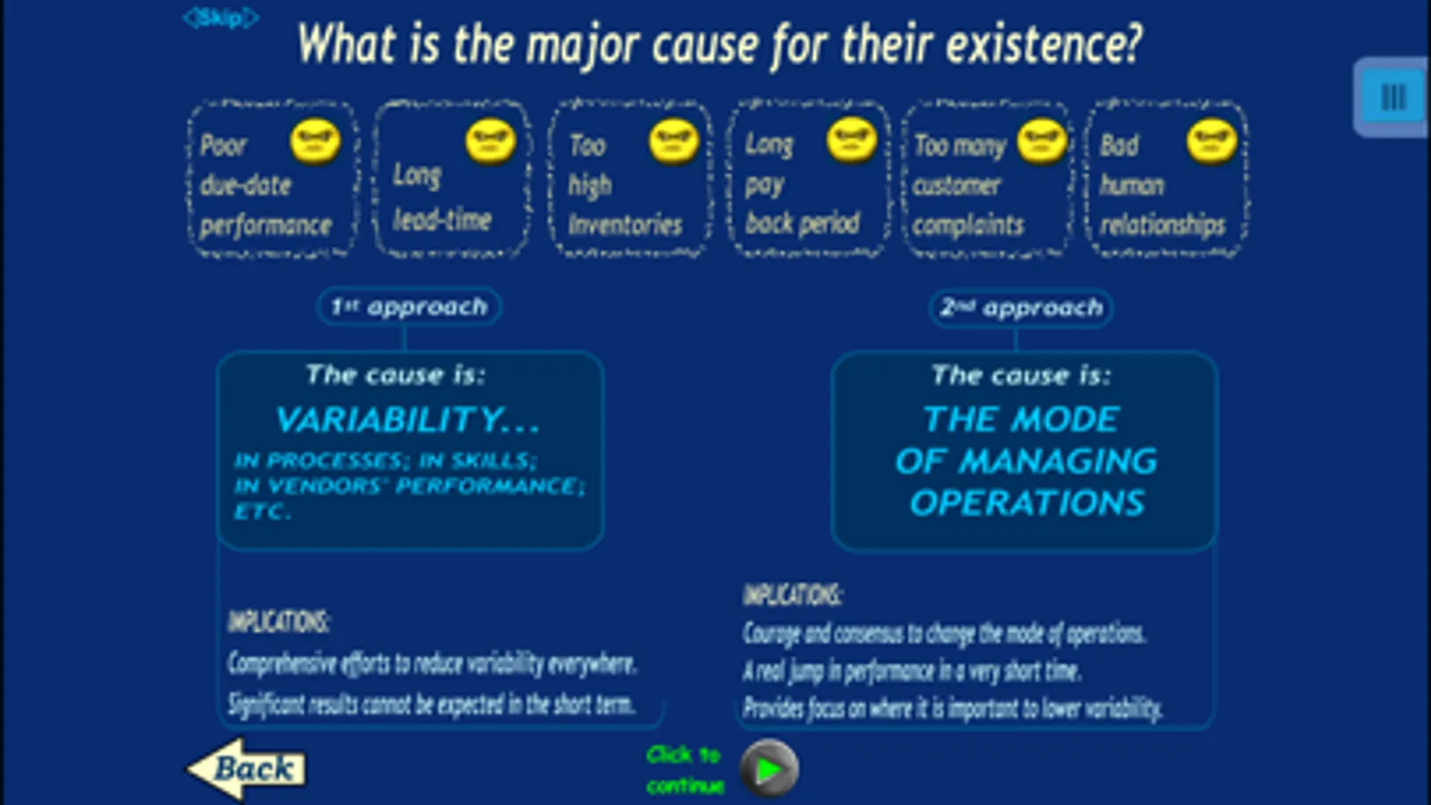 This learning tool is an interactive presentation containing detailed knowledge for applying the Theory of Constraints into Operations. Includes examples, case studies and simulations.