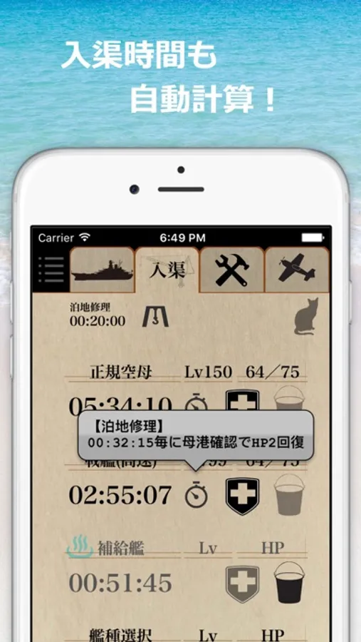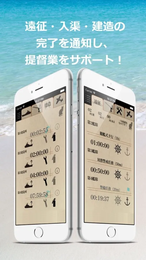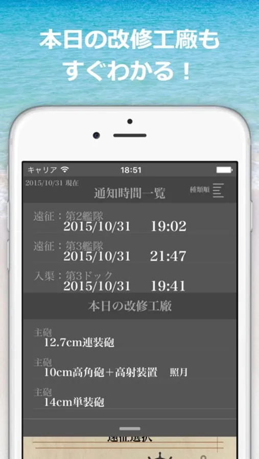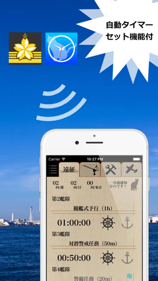 遠征・入渠・建造の完了時間にあわせて、 アラームでお知らせ!