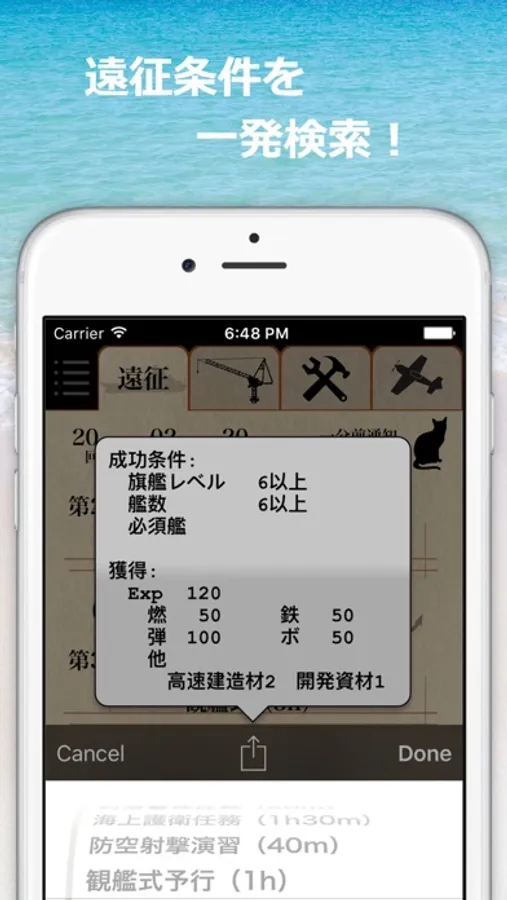 遠征情報(成功条件・獲得資材)を参照することが出来ます。