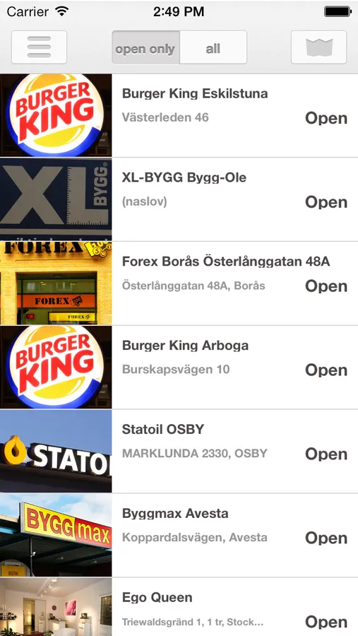 Öppettider is a search service for Sweden, containing opening hours, address and direct phone to stores and warehouses, banks, post offices, services, gas stations and mehanics. The map shows where it's open.