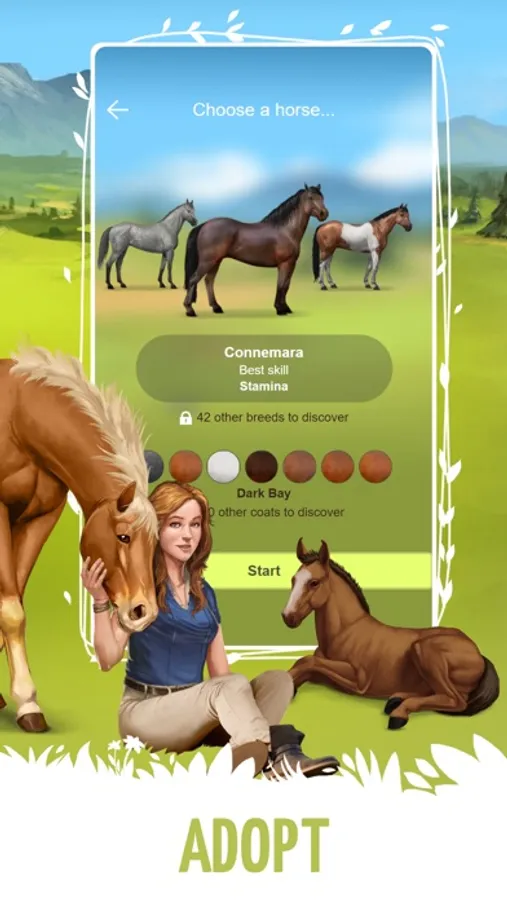 Choose your horse from over 50 breeds (purebred Arabian, Fjord, French Riding Pony, Shetland…) with 17 different coats. You can even choose ponies, donkeys or unicorns.