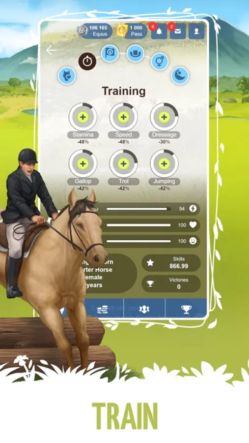 Select the best tack (saddle, saddle cloth, bridle, etc.) to increase your champion's performance.