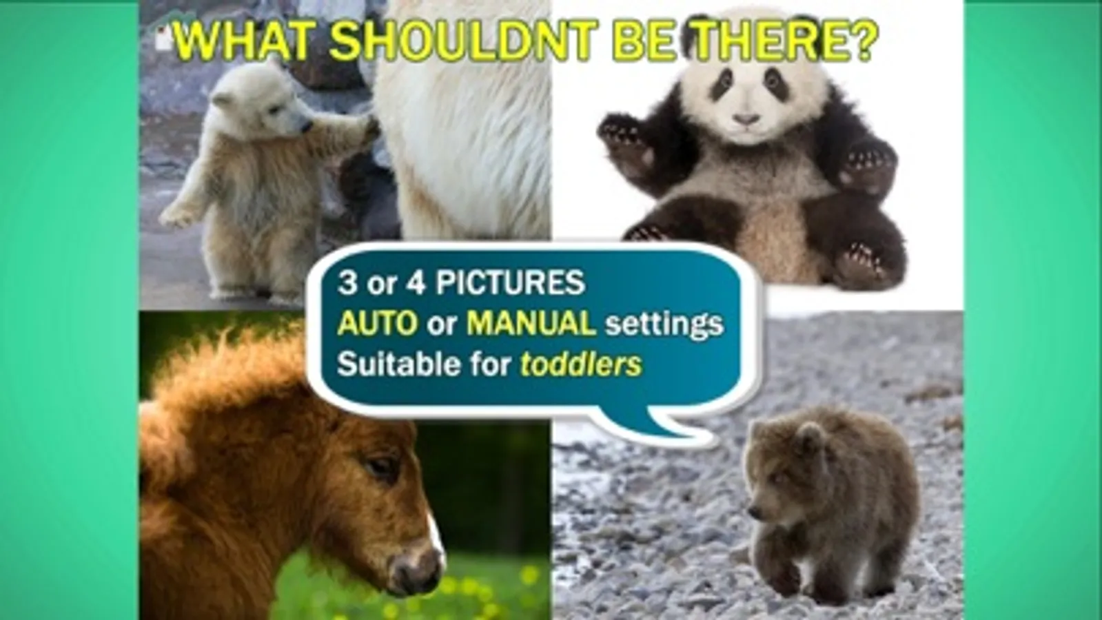 Pleasant voiceover and wonderful illustrations will accompany every choice. AUTO and MANUAL settings for the child's convenience. Find the picture that doesn't belong within 7 topics or between different topics!