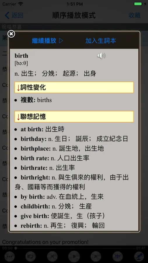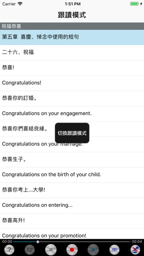 本APP每课都配有详细的中文字幕,并配以强大的可跟读复读的播放器,单词即按即查(联想记忆、常用词组、同义词辨析等),课文内容轻松点读、口语跟读练习、支持后台播放、多种播放学习模式!