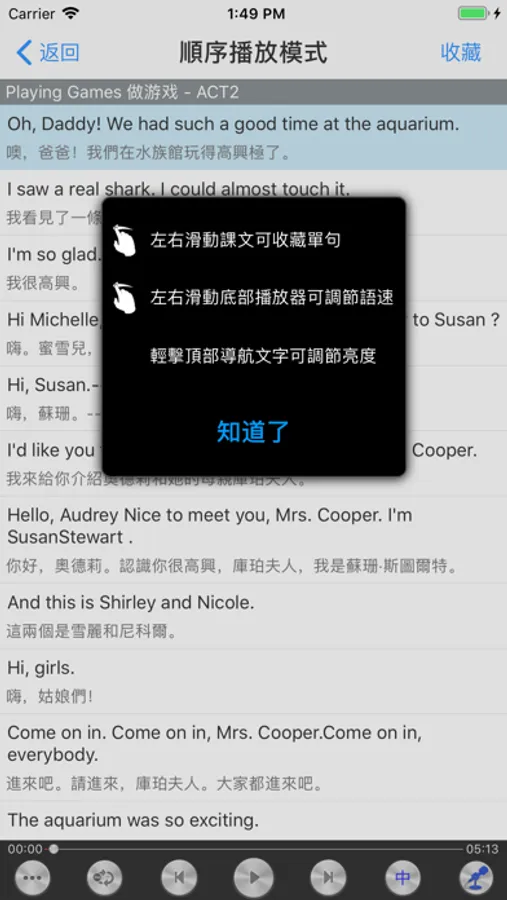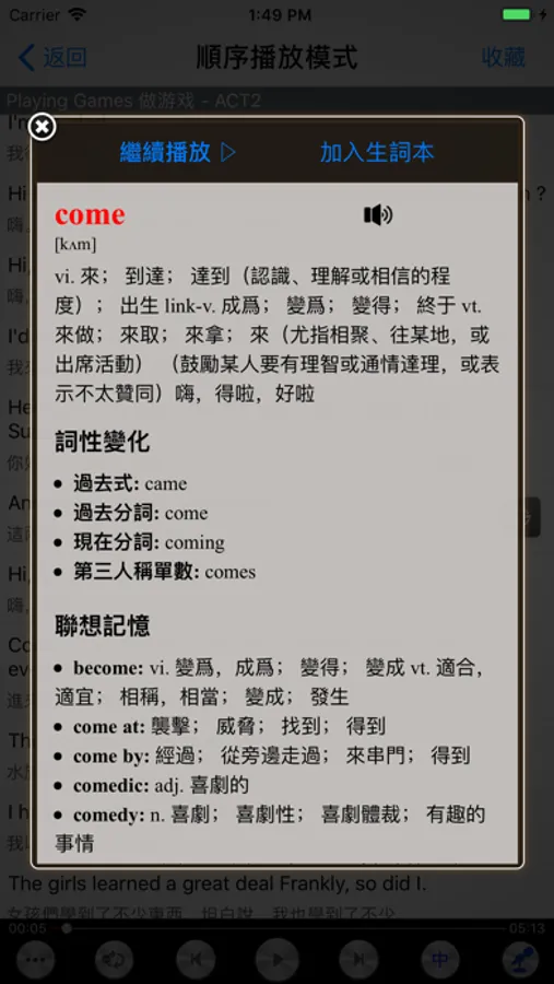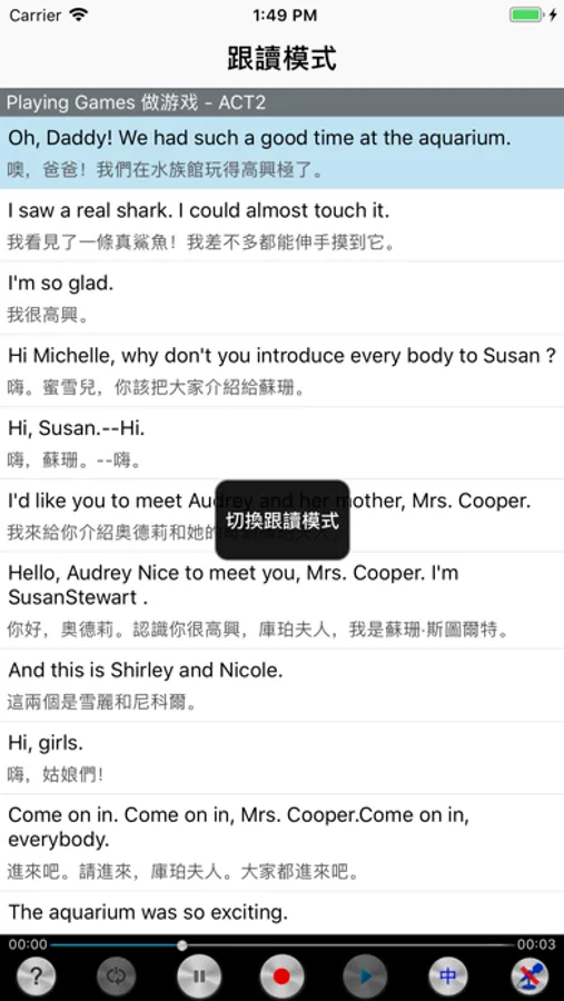 本APP每课都配有详细的中文字幕,并配以强大的可跟读复读的播放器,单词即按即查(联想记忆、常用词组、同义词辨析等),课文内容轻松点读、口语跟读练习、支持后台播放、多种播放学习模式!