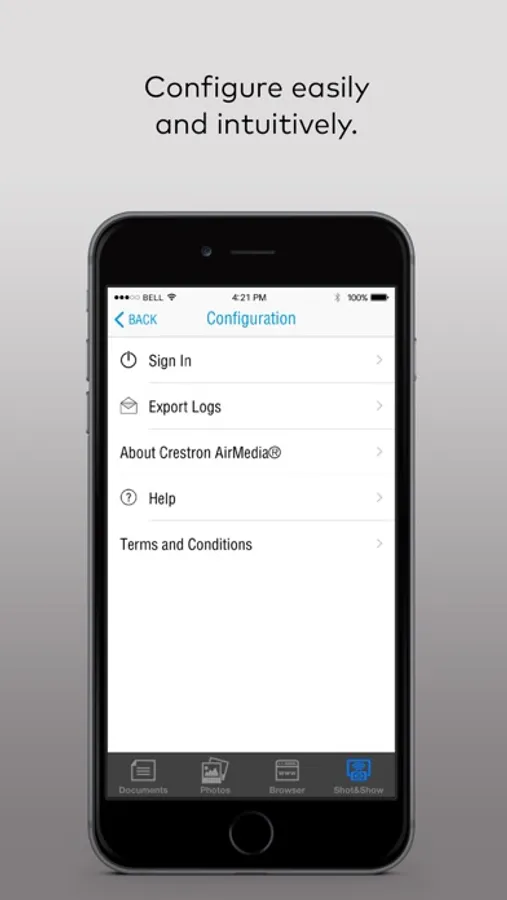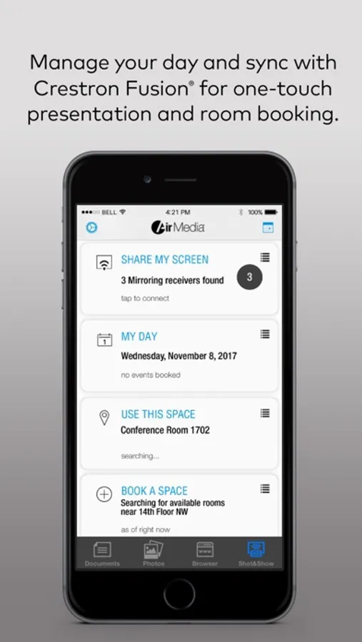 With Crestron AirMedia® you can walk into a room and wirelessly present slides, spreadsheets, documents, on-device videos and photos, even web pages and apps – all on the room display from your iPhone® or iPad®. With new full screen device mirroring, presenting directly from your favorite app is more intuitive and with better quality than ever before. The updated interface with optional Crestron Fusion® calendaring and PinPoint™ proximity beacon support allows for the fastest full-screen connection experience available – no more being tied to a laptop or podium. Requires a Crestron AirMedia wireless gateway (AM-101), or Crestron product with AirMedia built-in: Crestron Mercury™, DMPS3-4K-250-C, or DMPS3-4K-350-C. AM-100 users will need to install the AirMedia for AM-100 app.