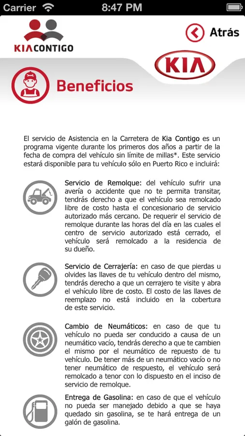 El servicio de Asistencia en la Carretera de Kia Contigo es un programa vigente durante los primeros dos años a partir de la fecha de compra del vehículo sin límite de millas*. Este servicio está disponible para tu vehículo sólo en Puerto Rico.