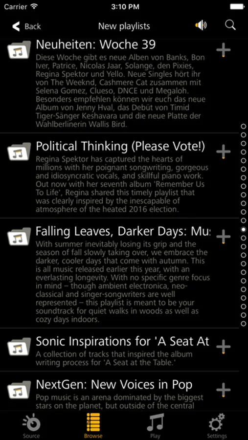 It is easily possible to browse the sources and start and control playback of audio contents. musicbook: app can be used to adjust all settings supported by the currently connected device. Examples are device name, input name, volume and balance control or network setup. It is even possible to start firmware update of a musicbook: device.