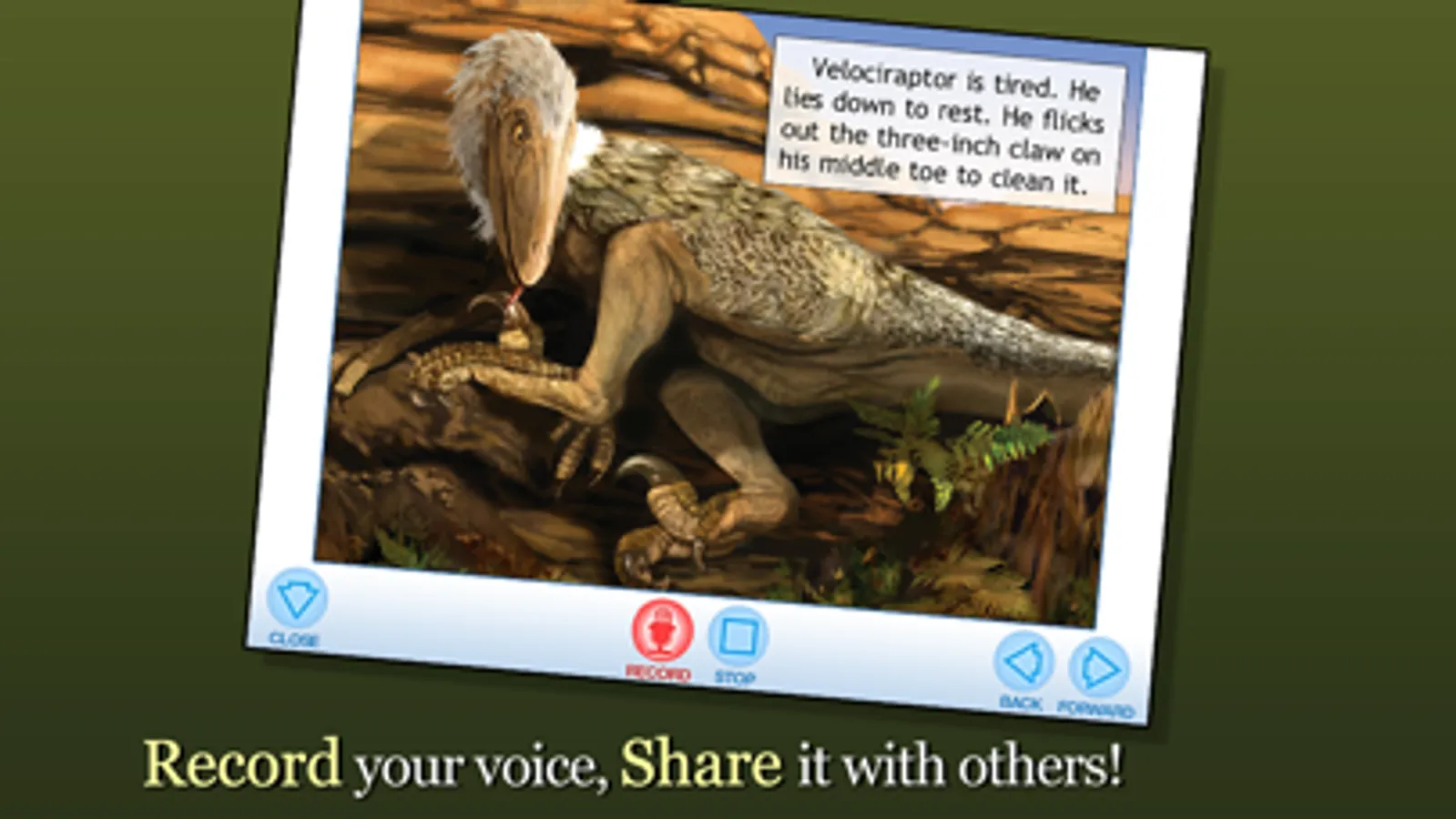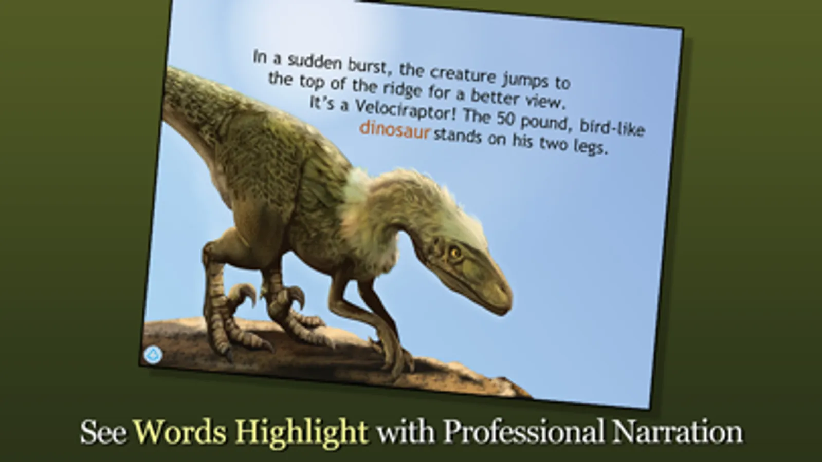 Join Velociraptor and his band- fierce predators and some of the fastest runners in the land- in this exciting digital book app! Explore pictures, learn new vocabulary, and personalize the story with your own narration. Jump inside to see how none of the other creatures in the valley want to be near when the Velociraptors come around!