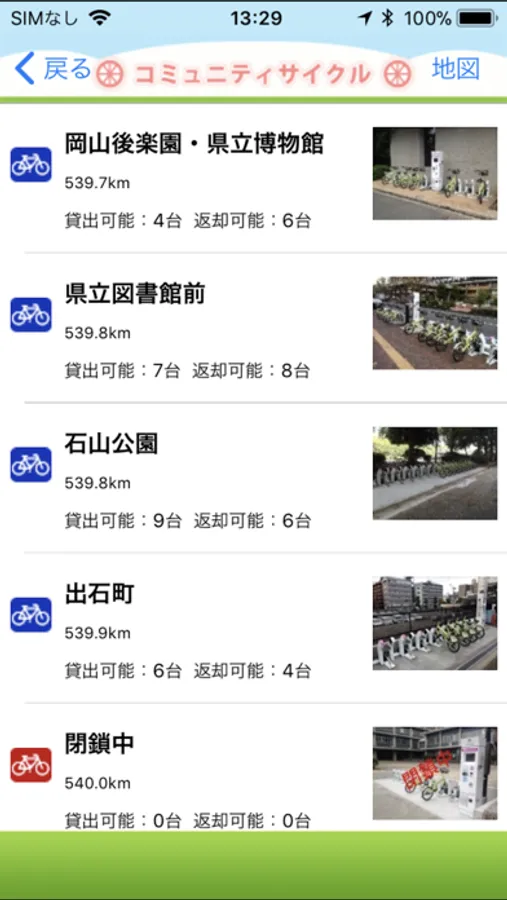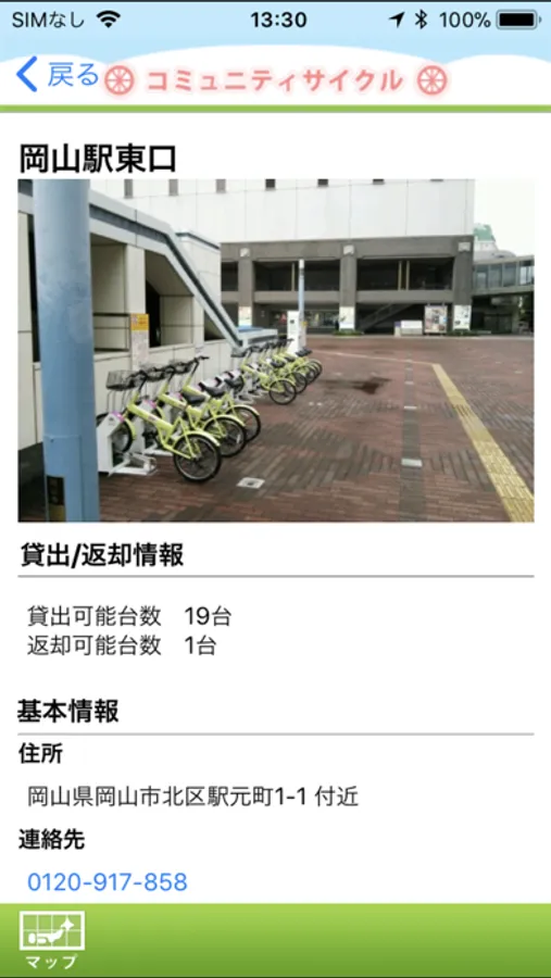 ももちゃりで利用可能なサイクルポート情報(場所、貸出可能台数、返却可能台数)を表示します。