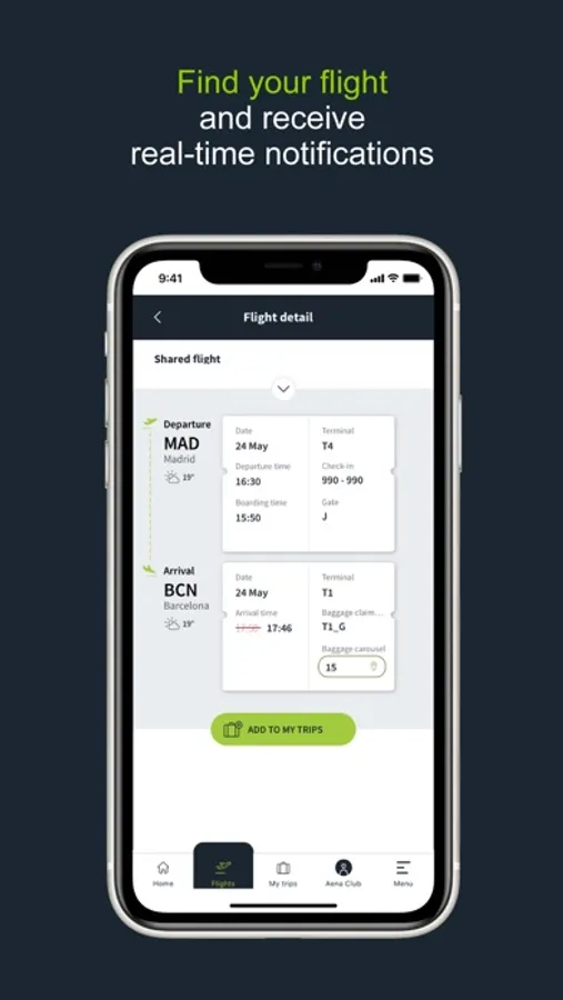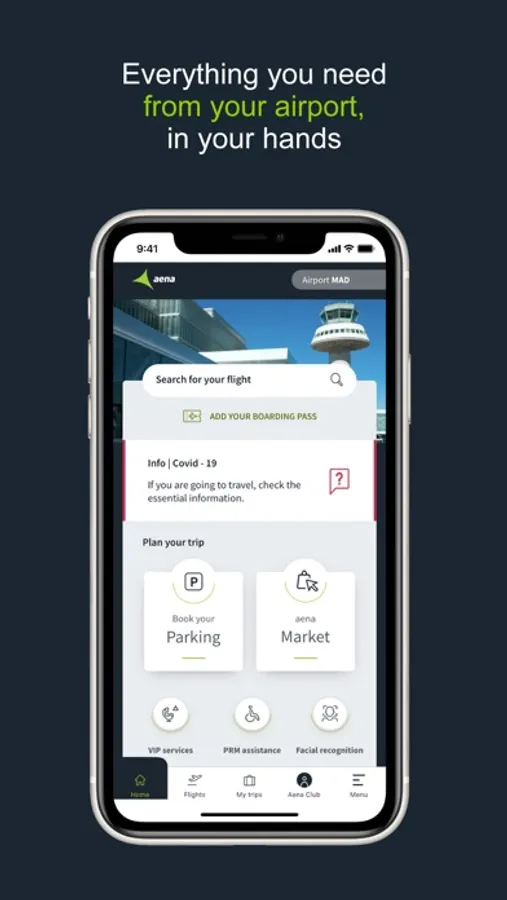 The official Aena app offers flight information of the 43 Spanish airports managed by Aena, including A.S.Madrid-Barajas, J.T.Barcelona-El Prat, Palma de Mallorca, etc.