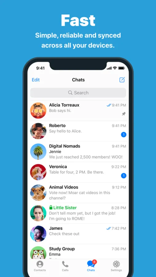 SYNCED: You can access your messages from all your phones, tablets and computers at once. Telegram apps are standalone, so you don’t need to keep your phone connected. Start typing on one device and finish the message from another. Never lose your data again.