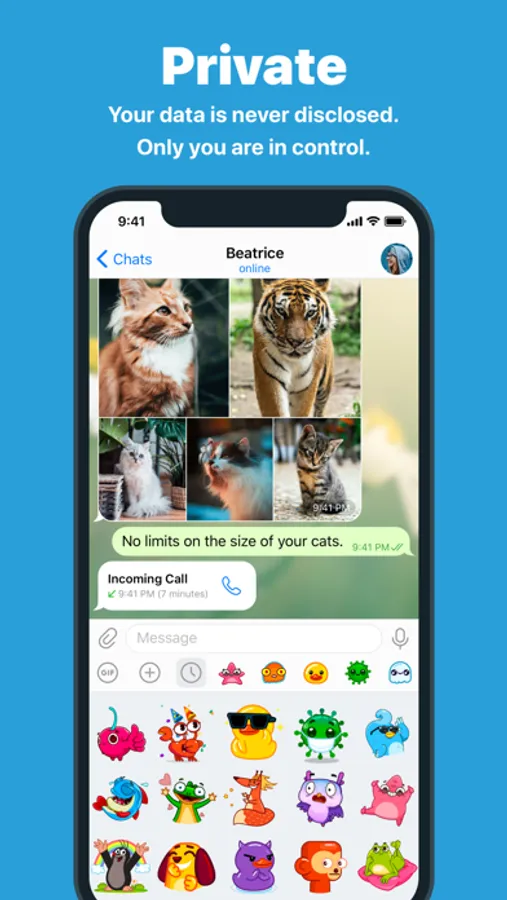UNLIMITED: You can send media and files, without any limits on their type and size. Your entire chat history will require no disk space on your device, and will be securely stored in the Telegram cloud for as long as you need it.