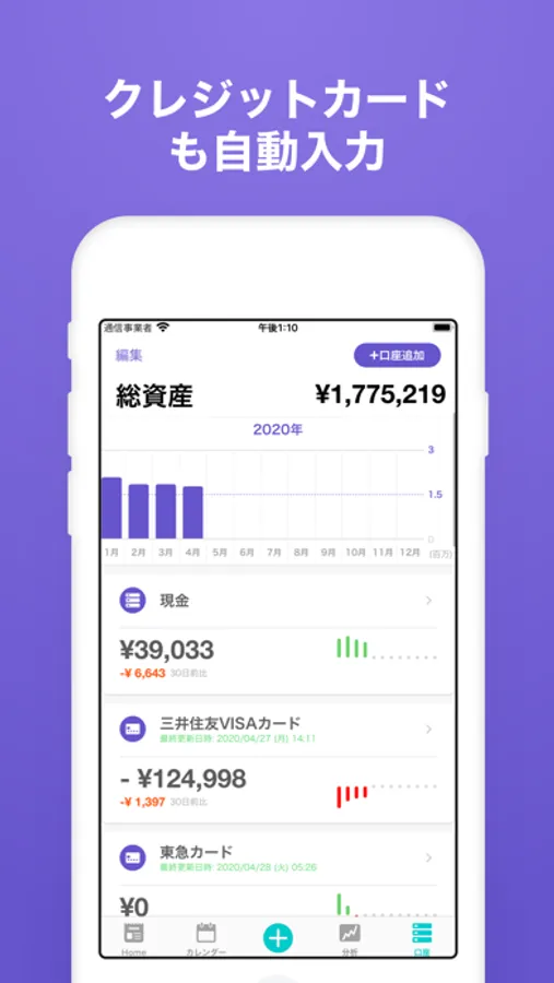クレジットカード、電子マネーやECサイト等のアカウント情報を登録しておけば、残高の確認、利用履歴を定期的に自動で取得して家計簿に記録します。