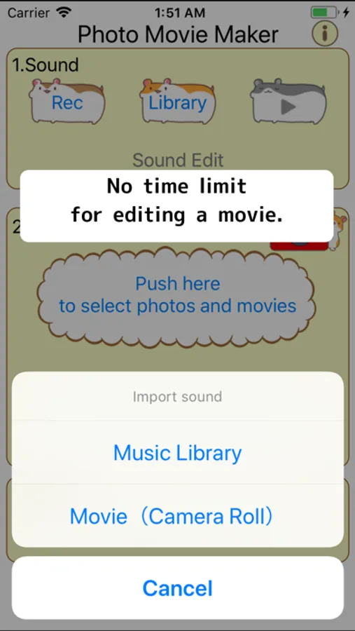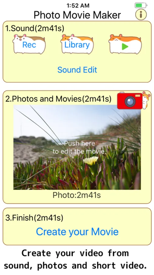 Recording your voice, or Select music from your iPod library or video of Camera Roll.