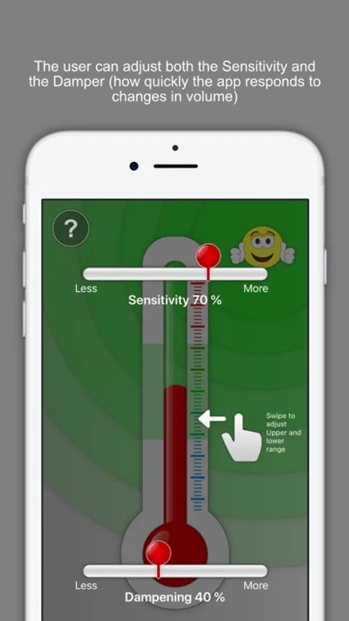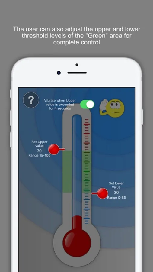 • the iPhone version of the app has a switch to enable the iPhone to vibrate should the upper threshold level be exceeded for longer than 4 seconds.