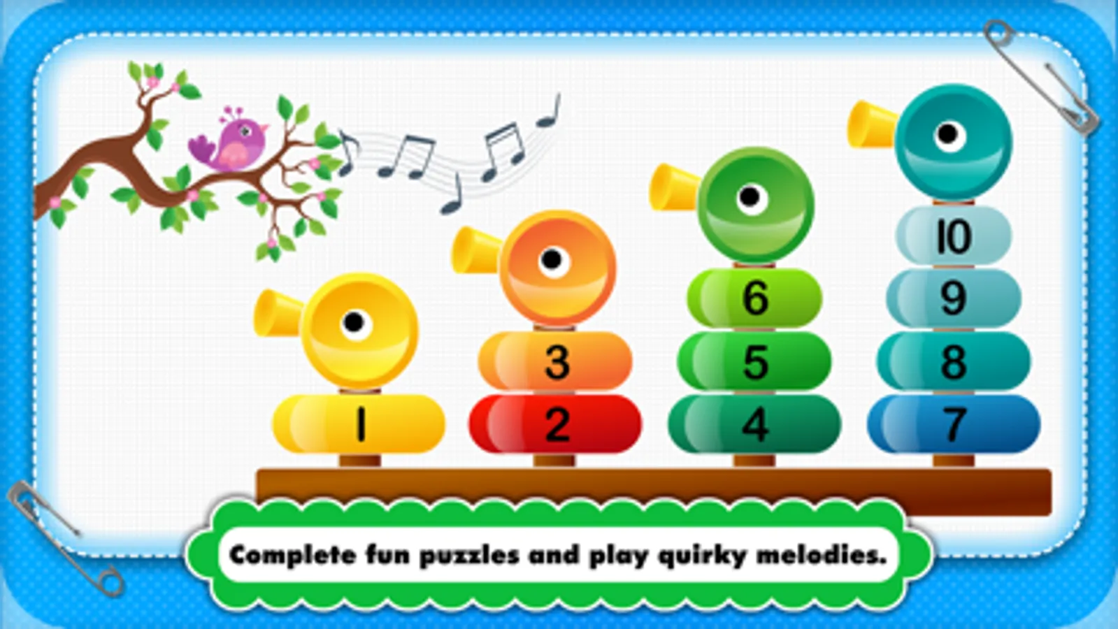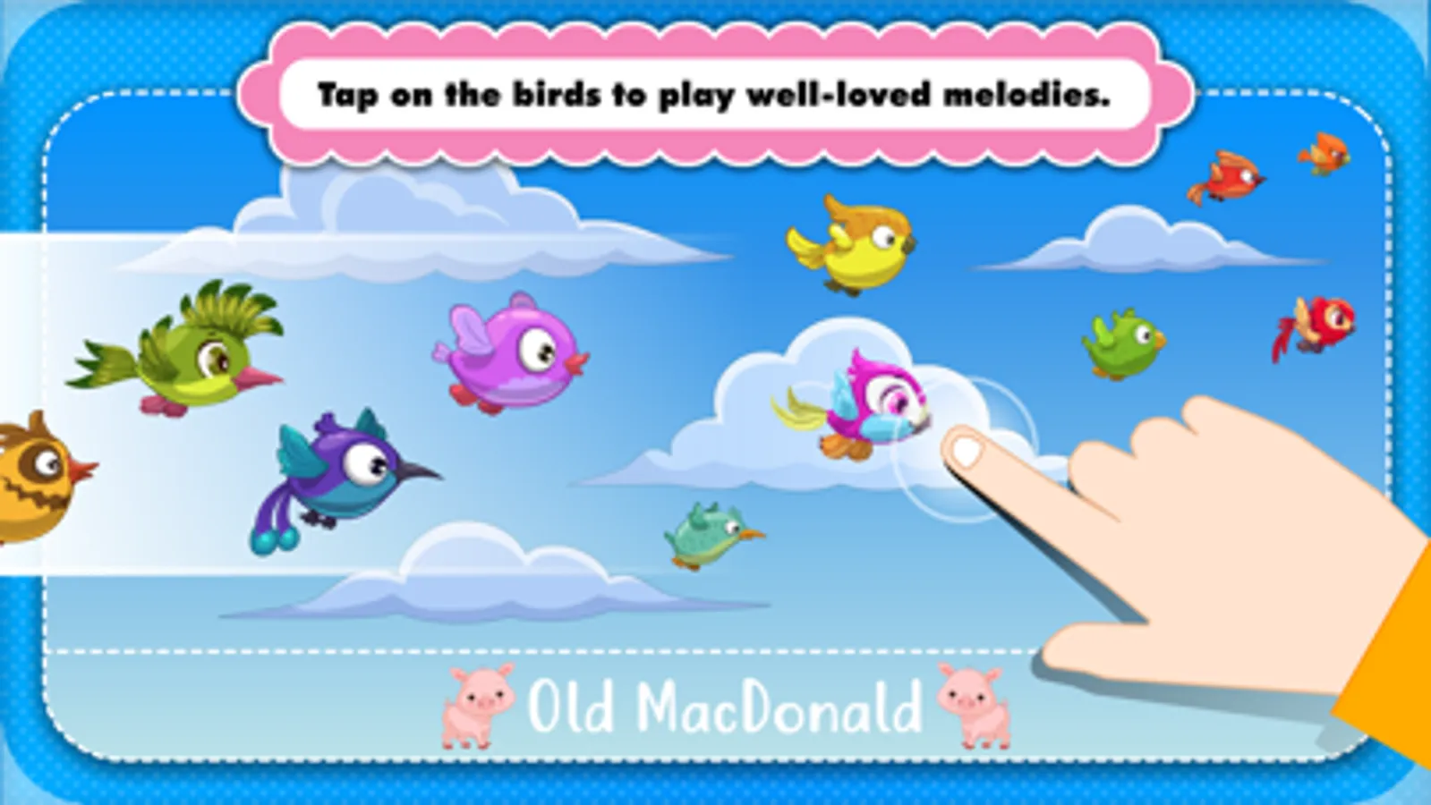 Time to test your ear for rhythm with our very special music birds. Tap on the birds at the right time to get them to chirp a melody for you. Choose out of five popular songs: Old MacDonald, Alphabet Song, Bingo, Twinkle Twinkle, and Five Little Monkeys.