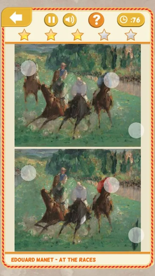 Twenty-four levels have lush paintings from the era of French and American impressionistic painting. Expand your cultural horizons with this virtual art gallery! You'll love carefully searching the masterful paintings and finding details you never noticed before- truly a feast for the eyes. The works of Vincent van Gogh, Edouard Manet, Claude Monet, Edgar Degas, Paul Cézanne, Mary Cassatt, Auguste Renoir and more are yours to behold on your mobile device. Learn art history as you browse through the gorgeous portraits, landscapes, seascapes, animals and flowers by impressionism painters.