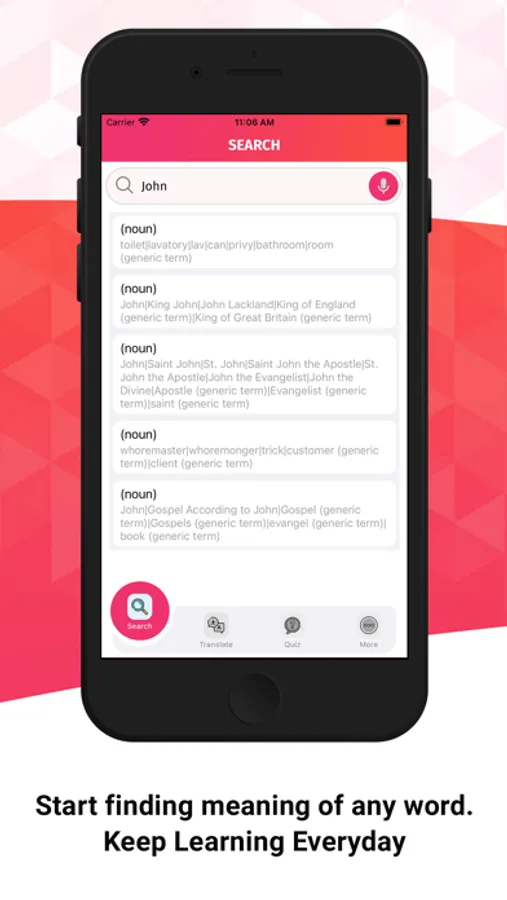 You can find meaning of any word instantly. Just typed out the word and tap search, you will have the meaning of the word instantly.