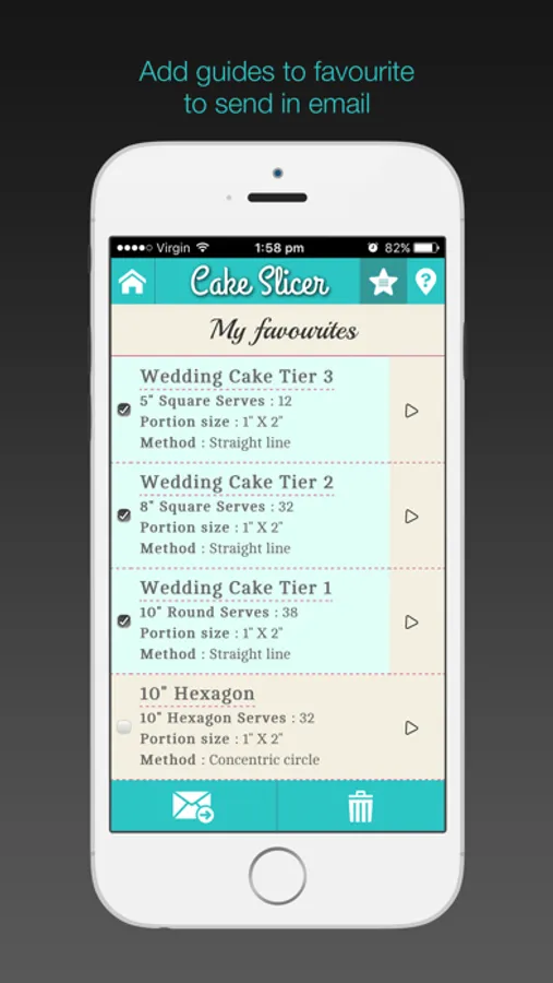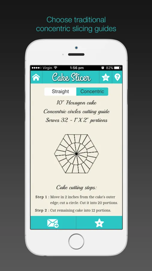 Cake Slicer is the most comprehensive guide to cutting cakes of most cake shapes and sizes into desired portion size. You can email from 412 cake cutting guides with step by step instructions from the app. No more searching the Internet to find correct cake cutting guides.