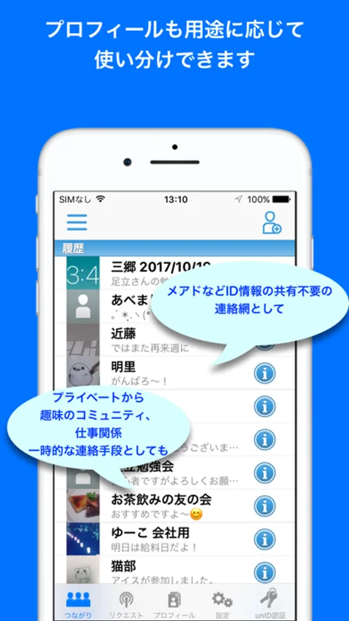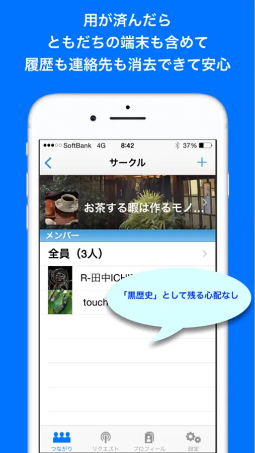 不要になった「つながり」はいつでも「相手端末側のメッセージ履歴も含めて」削除ができるアプリですので、「黒歴史を残さない安心なメッセージアプリ」として、お互いに気楽に利用できます。