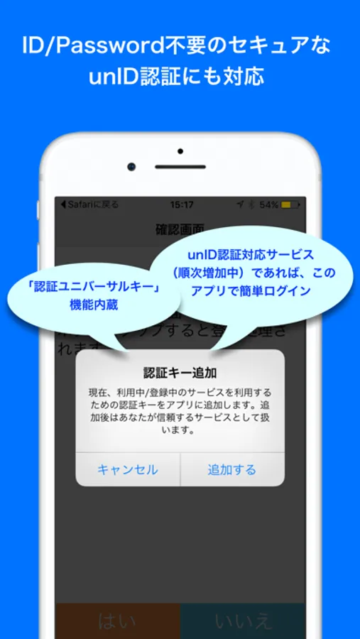 また本アプリは「認証ユニバーサルキー」機能に対応していますので、unID認証をサポートする各種サービスの認証キーをこのアプリに保存することでID,Password不要のログイン認証にも利用できます。