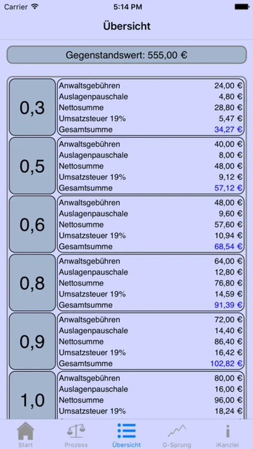 - Übersicht von Anwaltsgebühren nach den im Rechtsanwaltsvergütungsgesetz am häufigsten vorkommenden Gebührensätzen