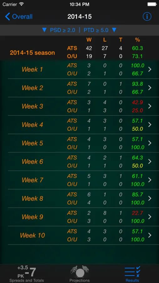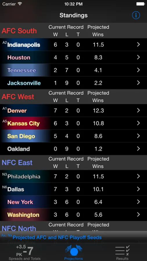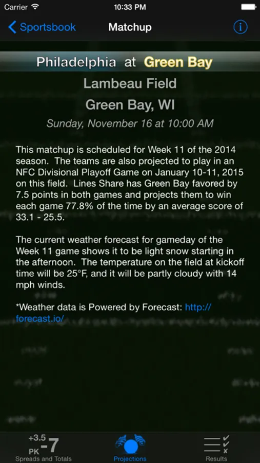 Using the most advanced prognostic algorithms available today, Lines Share predicts the outcome of every game of the season, months in advance. In addition, the predicted outcomes are used to predict the final standings, playoff picture, and winner of the Big Game.