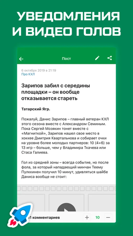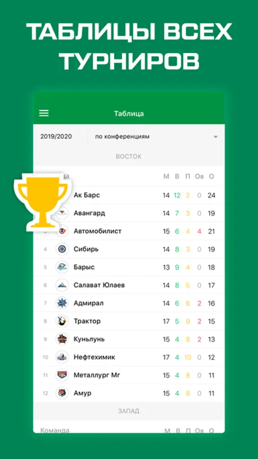 • Текстовые трансляции матчей, календарь и таблица КХЛ;