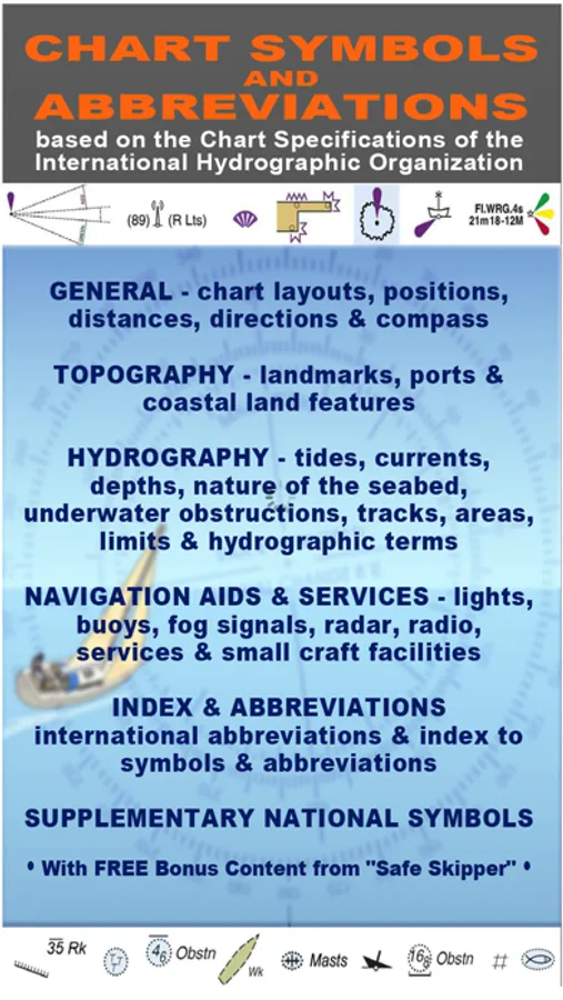 "CHART SYMBOLS & ABBREVIATIONS" provides quick reference to the "INT 1" symbols specified by the International Hydrographic Organization (IHO) for use on International marine charts.