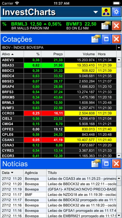 ° Janela de cotações com vários portfólios: Índices Bovespa, classificações setoriais, etc.