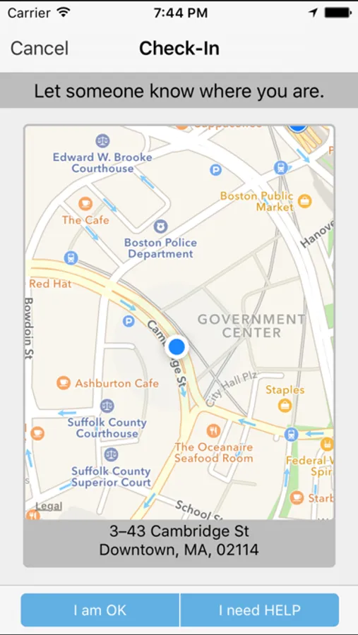 Users can share their location on a map and indicate if they are “OK” or “Need Help”. This information can be shared with friends and family by Email and SMS.