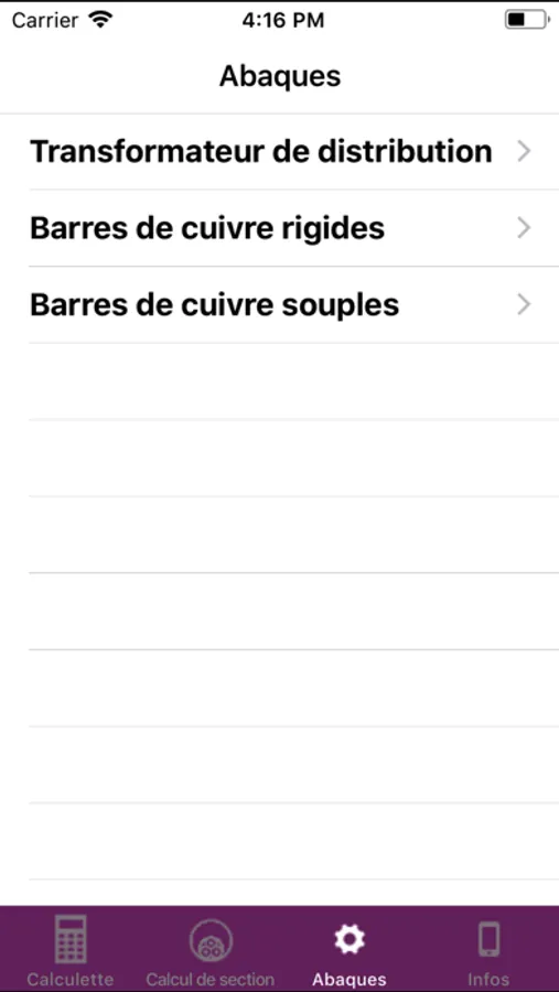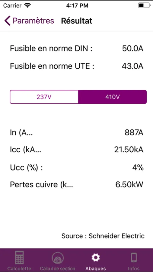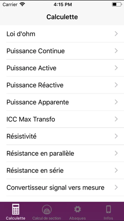 Cette application propose des calculettes électrotechniques telles que (Loi d'ohm, Puissance active, réactive, apparente, ICC Max transfo, Résistivité, Résistances en parallèle, Résistances en série, Convertisseur de signal 4-20mA 0-5V...) Et d'autre à venir...