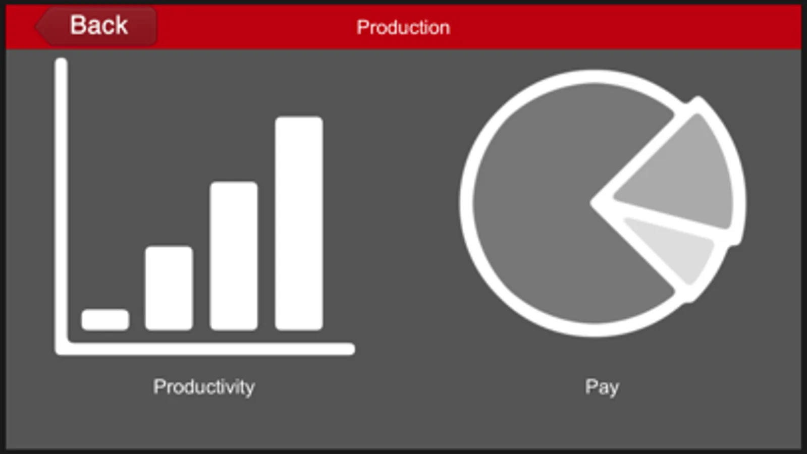 The Production section allows the user with a disability to see the measure of their work production in concrete terms, using a graph to track timed and/or counted elements of the job. Targets can be set on the graph by the employer to clarify work expectations. A second graph measuring earnings and lost wages is available to provide concrete information about work choices.