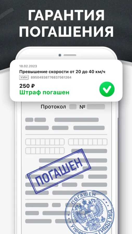 Мы гарантируем погашение штрафов, оплаченных через наше приложение. Мы дополнительно уведомляем соответствующие органы (ГАИ, ГИБДД и казначейство) о факте оплаты. Это гарантирует, что ваша оплата не потеряется.