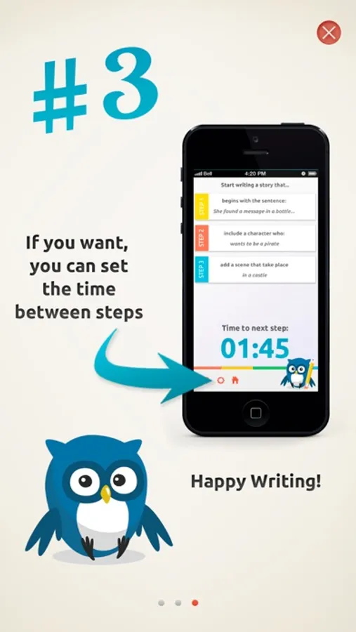 It's easy. You just have to press "start" and the app gives you the first prompt to start writing your story. Choose the one that you most like and fire up your writing. Then, every minute (or the period of time you choose; you can set it in the app settings) the app will give you a new prompt for you to add new ideas, words, characters, sentences, places or actions to the plot. Quite a challenge to turn your writing into a game!